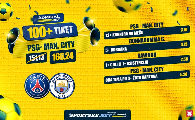 AdmiralBet je i za ovaj meč pripremio poseban 100+ tiket, sa pojačanom kvotom 166,24, za koju je potrebno da: