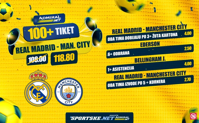 AdmiralBet je za ovaj meč pripremio poseban 100+ tiket, sa pojačanom kvotom 118,80, za koju je potrebno da: