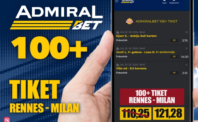 AdmiralBet 100+ tiket - Kvota 121.28 na utakmicu Rena i Milana!