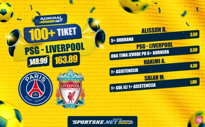 AdmiralBet je spremio sjajan 100+ tike posvećen ovoj utakmici, a u centru pažnje biće po mnogima trenutno najbolji fudbaler planete Mohamed Salah.