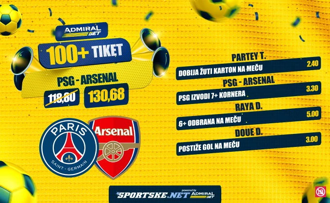 AdmiralBet je za ovaj meč pripremio poseban 100+ tiket sa kvotom 130,68 za koju je potrebno da: