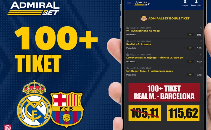 AdmiralBet je i za ovaj meč pripremio 100+ tiket sa kvotom 115,62 za koji je potrebno da: