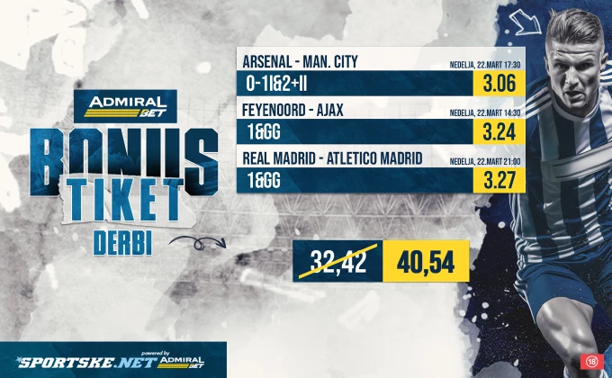 AdmiralBet je pripremio poseban bonus tiket sa pojačanom kvotom 40,54, a za nju je potrebno da: