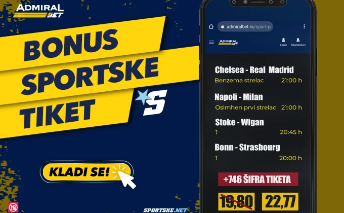 Kao i svakog dana, AdmiralBet je spremio zanimljiv bonus tiket sa pojačanom kvotom sa 19,80 na 22,77.