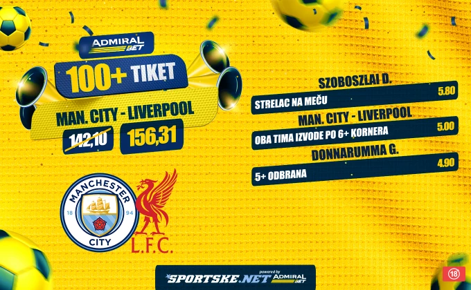Danas od 17.30 igra se veliki derbi između Mančester sitija i Liverpula, a AdmiralBet i Sportske su za vas pripremili novi 100+ tiket, tiket sa bonus kvotom koja je sa 142.10 skočila na 156.31!