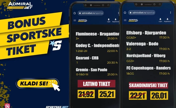 AdmiralBet i Sportske vam svakodnevno donose bonus tikete, odnosno tikete koji u sebi imaju uvećanu ukupnu kvotu.