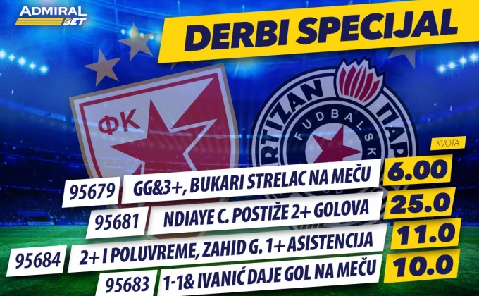 Ovog subotnjeg popodneva na programu je 172. "večiti derbi" na stadionu Rajko Mitić i kako ste već navikli na AdmiralBet-u, svi najveći mečevi sveta sa sobom donose i specijale.