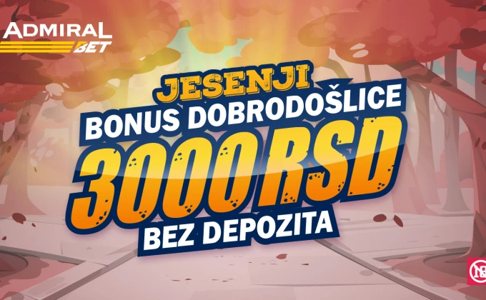 Sve igrače koji se do kraja jeseni otvore korisnički nalog na sajtu AdmiralBet.rs očekuje sjajnih 3000 dinara, bez prethodne uplate depozita, od čega je 1500 dinara izdvojeno za sportsko klađenje, dok je drugih 1500 dinara odvojeno za slot igre i virtuale. Sve što je potrebno je da se izvrši registracija na ovom linku ili putem AdmiralBet Android ili iOS aplikacije i uzbudljivi jesenji bonus će odmah biti uplaćen na Vaš AdmiralBet nalog.To nije sve, jer nakon kompletirane registracije, prva uplata depozita sa sobom povlači i fantastičnih 100% bonusa u visini do 40.000 dinara.