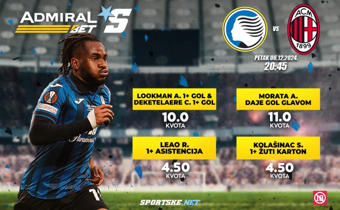 Atalanta je u naletu i ne vidi se kraj pobedničkoj seriji ekipe Đanpjera Gasperinija, golovi Ademole Lukmana i Šarla De Ketelarea vrede kvotu 10, a žuti karton borbenog Kolašinca 4.50.