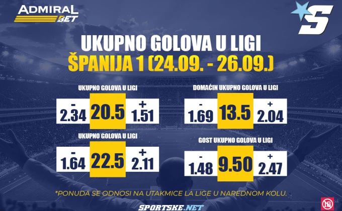 Na radost ljubitelja španskog fudbala, Primera će odigrati vanredno kolo tokom nedelje, pa je AdmiralBet sada već tradicionalno pripremio zanimljiv specijal na broj golova u čitavom kolu.