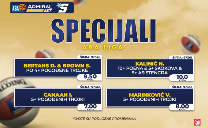Za duel u Podgorici dajemo kvotu 10.00 da će Zvezdin Nikola Kalinić upisati 10+ poena. 5+ skokova i 5+ asistencija, a tu je i kvota 7.00 da će bek crveno-belih Ajzea Kenan ubaciti pet ili više trojki.