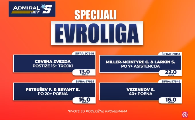 Tu je i kvota 16.00 da će Zvezdin Petrušev i Efesov Brajant ubaciti po 20+ poena, a kombinujemo još Zvezdinog Milera-Mekintajera i Efesovog Larkina da će imati po 7+ asistencija.