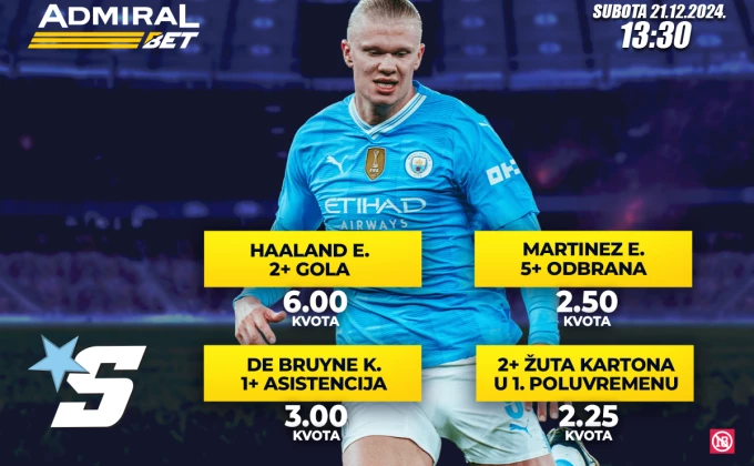 Nudimo kvotu 6,00 da će napadač Sitija Erling Haland postići najmanje dva gola na meču.