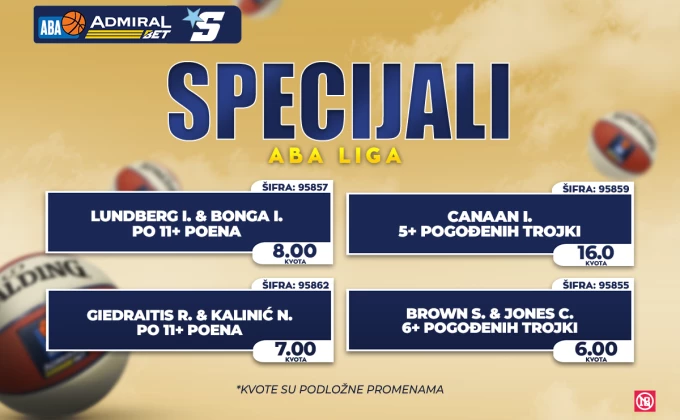AdmiralBet je za vas pripremio veliki broj specijala za utakmice AdmiralBet ABA lige.
