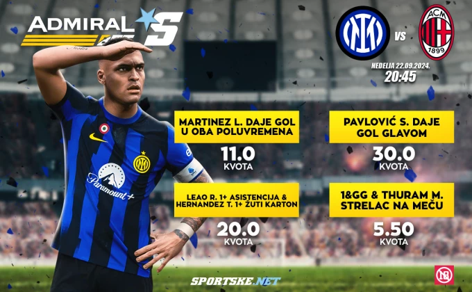 Ukoliko verujete u Lautara Martineza, onda će važiti kvota 11.00 da će dati gol u oba poluvremena. Ako verujete u Strahinju Pavlovića da će dati gol glavom, važiće kvota 30.00, a to nije sve.
