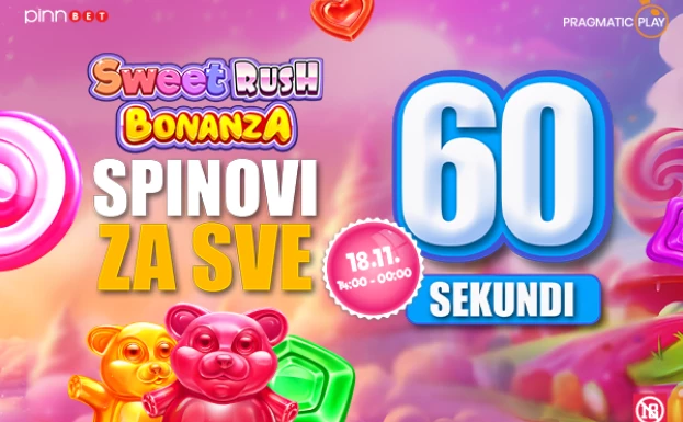 Pripremite se za pravu poslasticu od slota! Samo danas, 18. novembra, od 14 časova do ponoći, svi registrovani PinnBet igrači koji pokrenu igru Sweet Rush Bonanza dobijaju 60 sekundi besplatnih spinova, u vrednosti od 5 dinara po spinu.