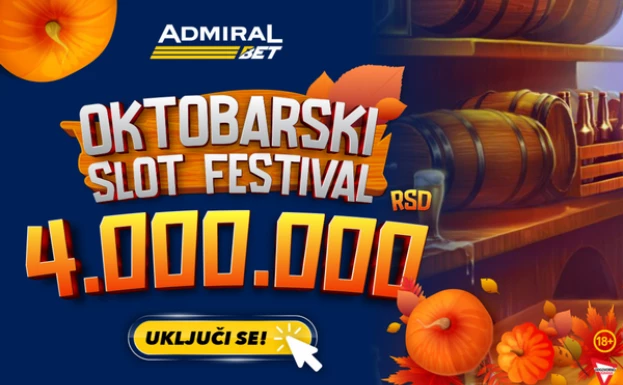 U AdmiralBet je stigao Oktobarski Slot festival sa neodoljivim repertoarom u vidu vrhunske zabave i mnogo nagrada i bonusa, sa ukupnim fondom od čak 4.000.000 dinara. Baš svakog dana u oktobru čeka vas prava festivalska euforija!