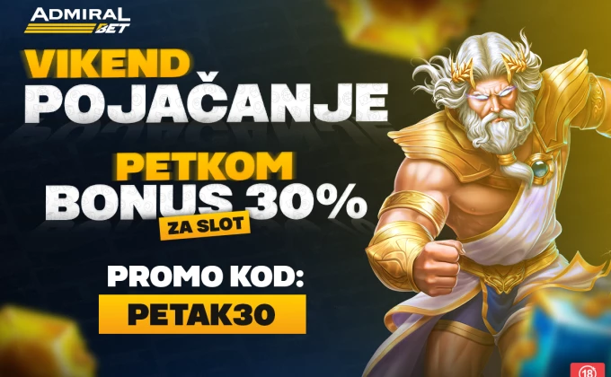 Samo danas, unesite ovaj promo kod prilikom prve dnevne uplate depozita na AdmiralBet.rs i osvojite 30% bonus sredstava za slot igre. Kod možete iskoristiti online, ali i na uplatnim mestima – samo ga recite operateru prilikom uplate. Bonus se dodeljuje na prvi depozit u danu koji sadrži kod, neophodno je samo da imate otvoren korisnički nalog.