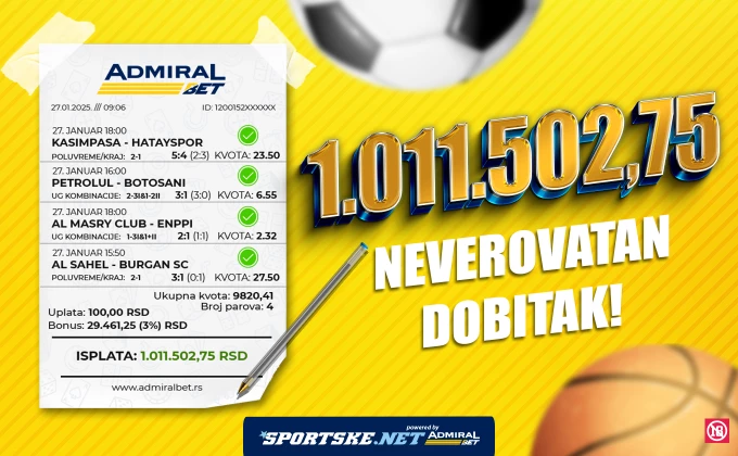 Neverovatan dobitak u AdmiralBetu: Kvota 9,20 za više od milion dinara!