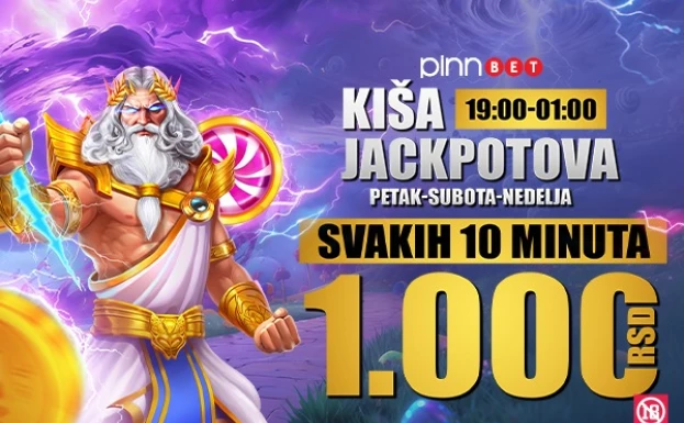 Svakog petka, subote i nedelje uveče od 19:00 časova do ponoći nam stiže rashlađenje. Naime, na svakih 10 minuta jedan igrač osvaja džekpot vredan 1.000 dinara, samo na PinnBet.rs! Sve što treba jeste da uložite samo 5 dinara na omiljene slot igre i strpljivo sačekate taj momenat, jer možda baš sledeći spin pokrene oluju.