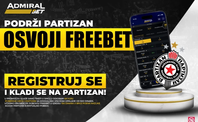 - Ako Partizan pobedi – osvajate freebet u visini 100 RSD x broj poena razlike!