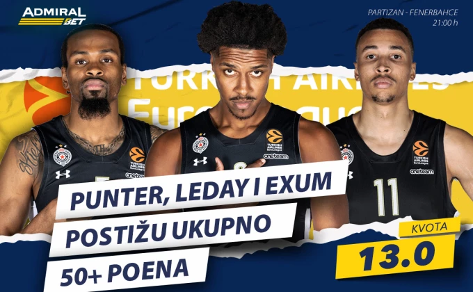 AdmiralBet kao i obično ima atraktivan SPECIJAL, u pitanju su opklade na velike kvote. Ona omiljena, Panter, LeDej i Egzum postižu 50+ poena je 13, Panter je na marginama 20+ koševa i 5+ asistencija, fantastični Egzum 15+ poena i 7+ asistencija, kvota je 20, naravno tu su Lesor i (15+ poena, 12+ skokova) na kvotu 18, koliko i Ledej (15+ poena i 10+ skokova).