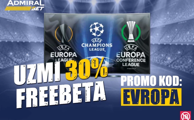 Pored toga, kladionica AdmiralBet je spremila i promo kod EVROPA koji svim igračima donosi 30% freebeta na prvu dnevnu uplatu depozita, svakog dana kada se igraju mečevi Lige šampiona, Lige Evrope i Lige konferencija. Promo kod je aktuelan do kraja sezone, a svi koji se budu kladili na mečeve pomenutih evro takmičenja će imati priliku da poboljšaju svoj plasman u Master ligi i budu među 10 najboljih igrača koji će ove nedelje podeliti 100.000 dinara, odnosno 4.000.000 dinara do kraja sezone.