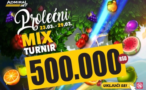 Prolećni turnir počinje 23. marta od 9 časova i traje sve do 29. marta do ponoći, kada će 40 najboljih igrača podeliti fenomenalnih 500.000 dinara. Svi igrači registrovani na AdmiralBet.rs mogu učestvovati u ovoj promociji, a sve ostale informacije vezane za Prolećni turnir se nalaze na ovom linku.