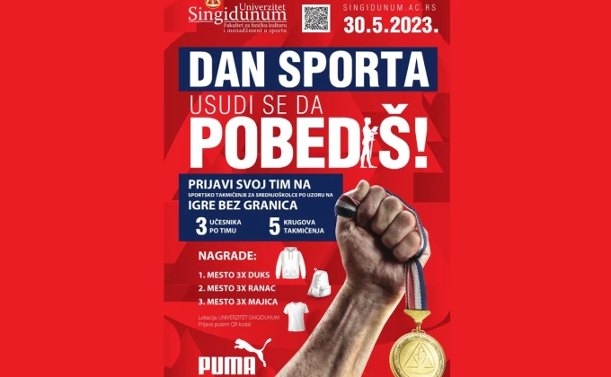 Dan sporta na Univerzitetu Singidunum biće održan u utorak 30. maja 2023. godine uprostorijama Univerziteta, Bulevar Peka Dapčevića 47a, sa početkom u 10 časova.