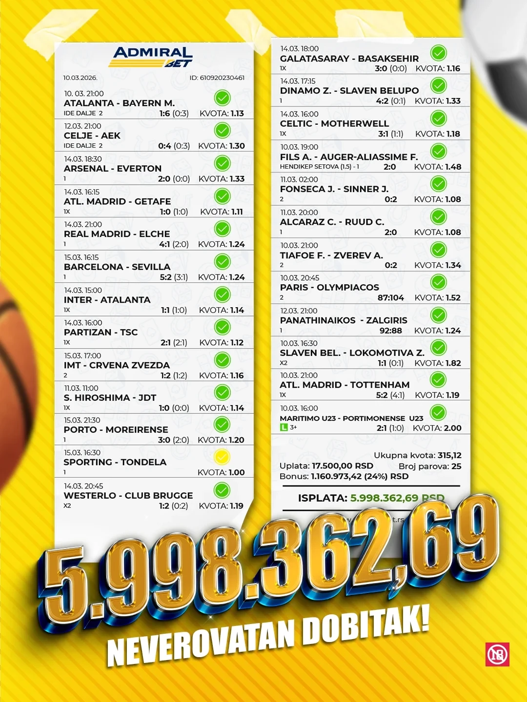 Ovaj vikend doneo je dva sjajna tiketa koji još jednom potvrđuju da se u AdmiralBet-u igra za velike stvari!