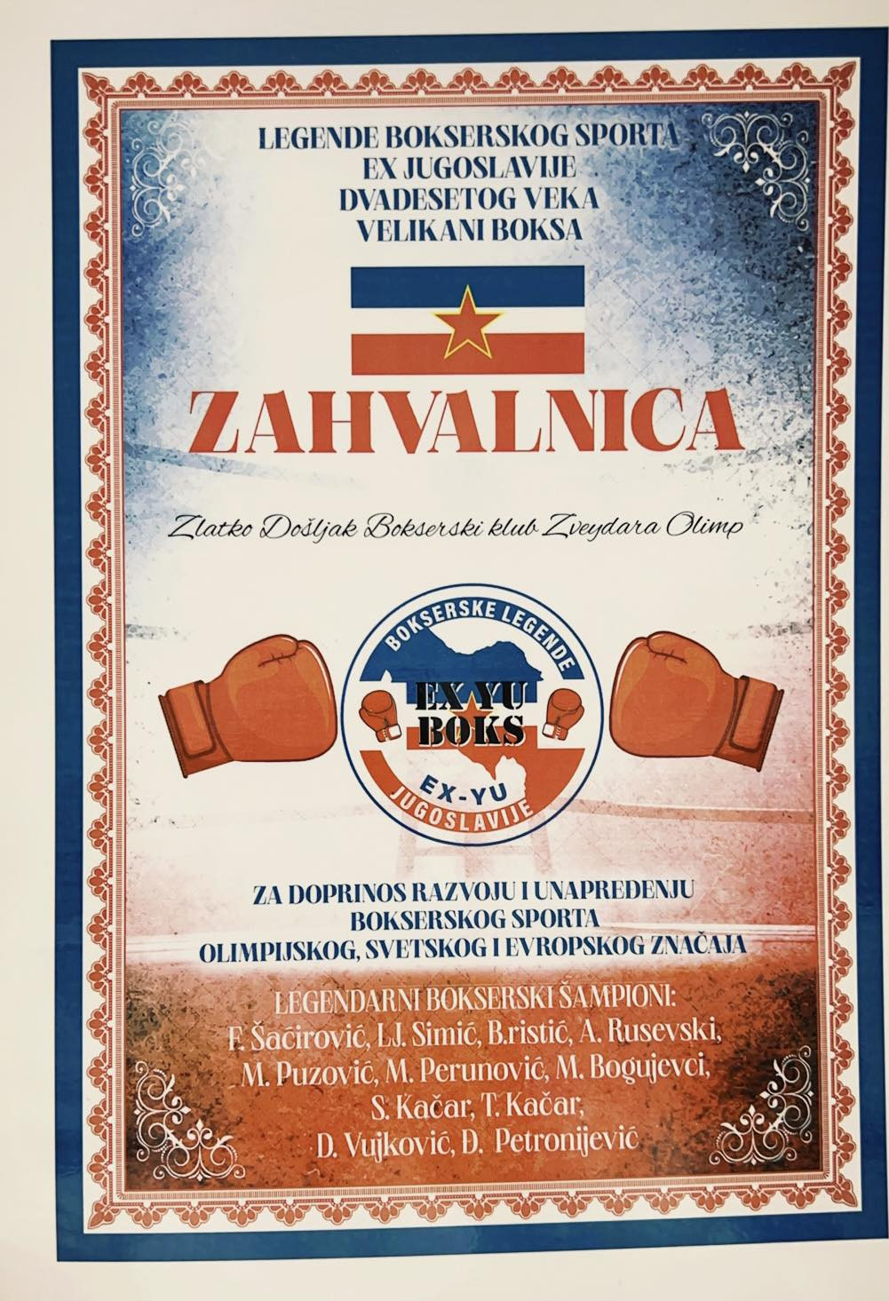 "Meni kao najmlađem veteranu, ukazana je velika čast i poziv da se pojavim na samoj promociji, gde mi je uručena zahvalnica u ime “Sedam veličanstvenih“ za moj novootvoreni Bokserski klub "Zvezdara Olimp" koji je za kratko vreme okupio veliki broj polaznika. Daću sve od sebe kako bi ovaj sport bio tamo gde i zaslužuje, a to je u samom vrhu sporta. Meni je moj selektor Tadija Kačar ukazao veliku čast pozivom da budem gost u njegovom domu, gde sam imao prilike da vidim sve njegove medalje što je osvojio za našu zemlju, a tako isto proglašen najboljim jugoslovenskim bokserom polusrednje kategorije dvadesetog veka, od najvećih velikana ovoga sporta.