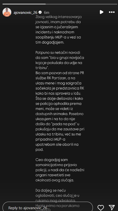 “Zbog velikog interesovanja javnosti, imam potrebu da se izjasnim o jučerašnjem incidentu i naknadnom saopštenju MUP u vezi sa tim događajem. Potpuno su netačni navodi da sam ‘bio u grupi navijača koja je pokušala da uđe na tribinu.’ Bio sam pozvan od strane PR službe RK Partizan AdmiralBet, a na ulazu je mene i mog saigrača sačekala predstavnica RK, kako bi nas sprovela u ložu.