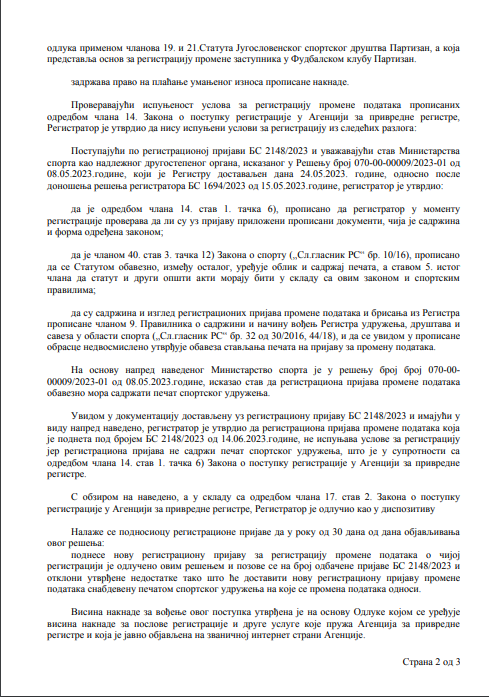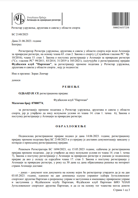 U pitanju je odluka Agencije za privredne registre po dopunjenoj registracionoj prijavi privremene uprave Fudbalskog kluba Partizan, koju je imenovalo Sportsko društvo Partizan dana 03.05.2023 godine, a u kojoj je dostavljena sva neophodna dokumentacija koju je zahtevala Agencija za privredne registre, uključujući dokaz da je Fudbalski klub Partizan član Sportskog društva Partizan od osnivanja do danas. Nažalost, Agencija za privredne registre smatra da je registraciona prijava morala biti snabdevena pečatom Fudbalskog kluba Partizan, iako je isti prisvojen od strane lica iz dosadašnje uprave i samim tim nedostupan. Iz tog razloga, poštujući odluke državnih organa, uložićemo žalbu na predmetnu odluku, jer smatramo da fizičko prisvajanje pečata od strane bivše uprave ne može biti razlog da ne bude registrovana nova legano imenovana privremena uprava", stoji u pismu.