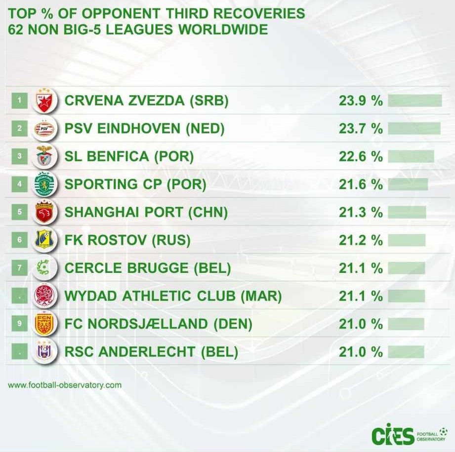 Naime, fudbalska opservatorija CIES objavila je listu najboljih ekipa po procentu oduzetih lopti u završnoj trećini terena van pet najjačih liga na čitavo svetu i po tom parametru je Zvezda prvi tim na svetu sa 23,9 posto uspešno oduzetih lopti.