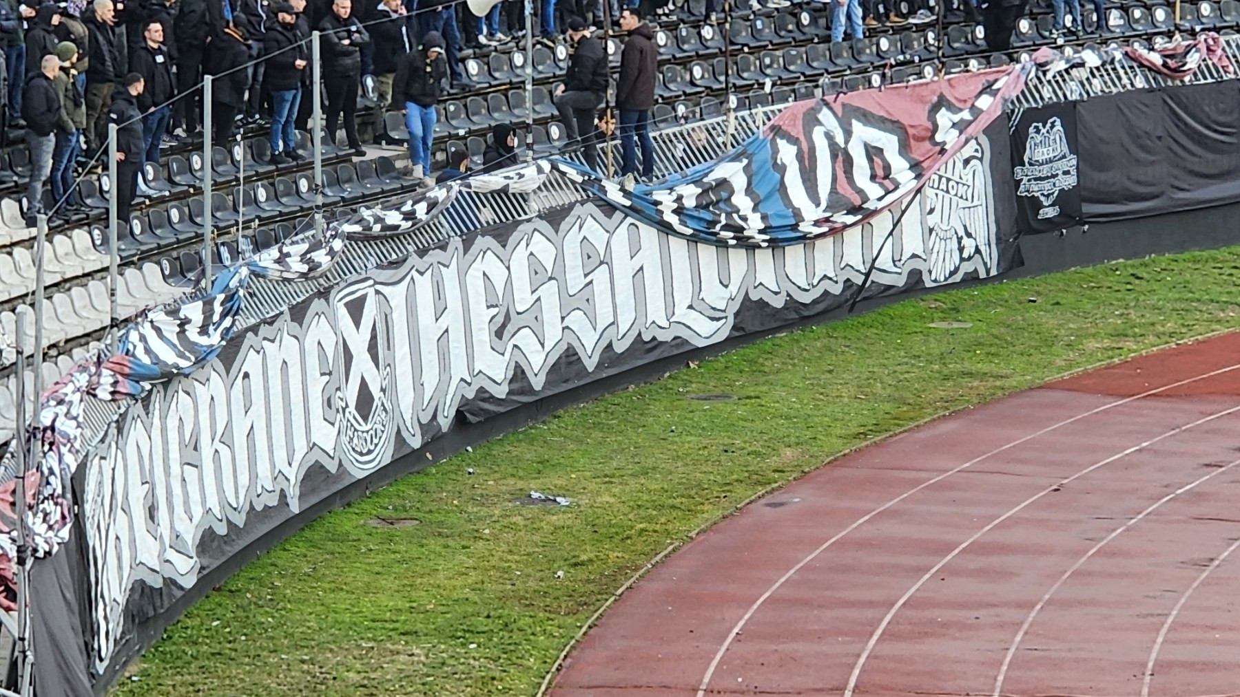 Na južnoj tribini bio je istaknut samo jedan veliki transparent, na kome je na engleskom pisalo "Beograd - Solun", uz grbove Partizana i Paoka.