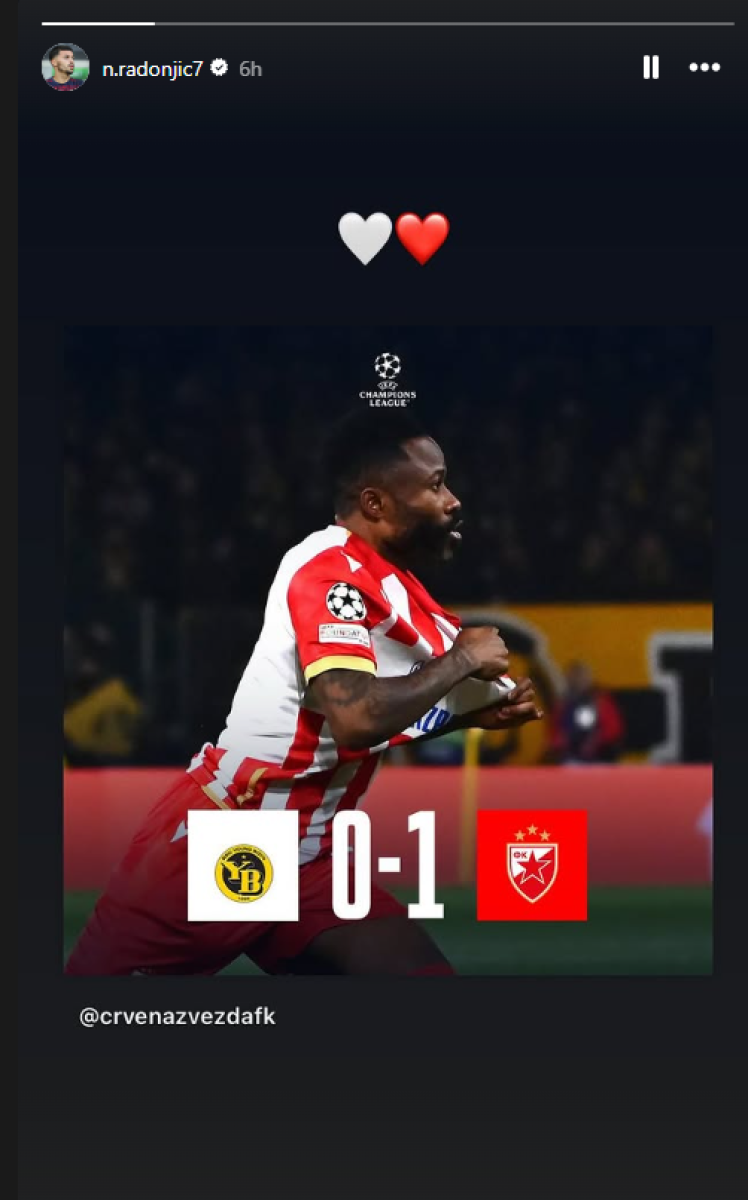 Srećan nakon prve Zvezdine gostujuće pobede u Ligi šampiona u ovom veku bio je Nemanja Radonjić, koji je na svom Instagramu podelio fotografiju konačnog rezultata utakmice uz emotikone belog i crvenog srca, iako je odstranjen iz tima i zbog nediscipline nije putovao sa saigračima u Švajcarsku.