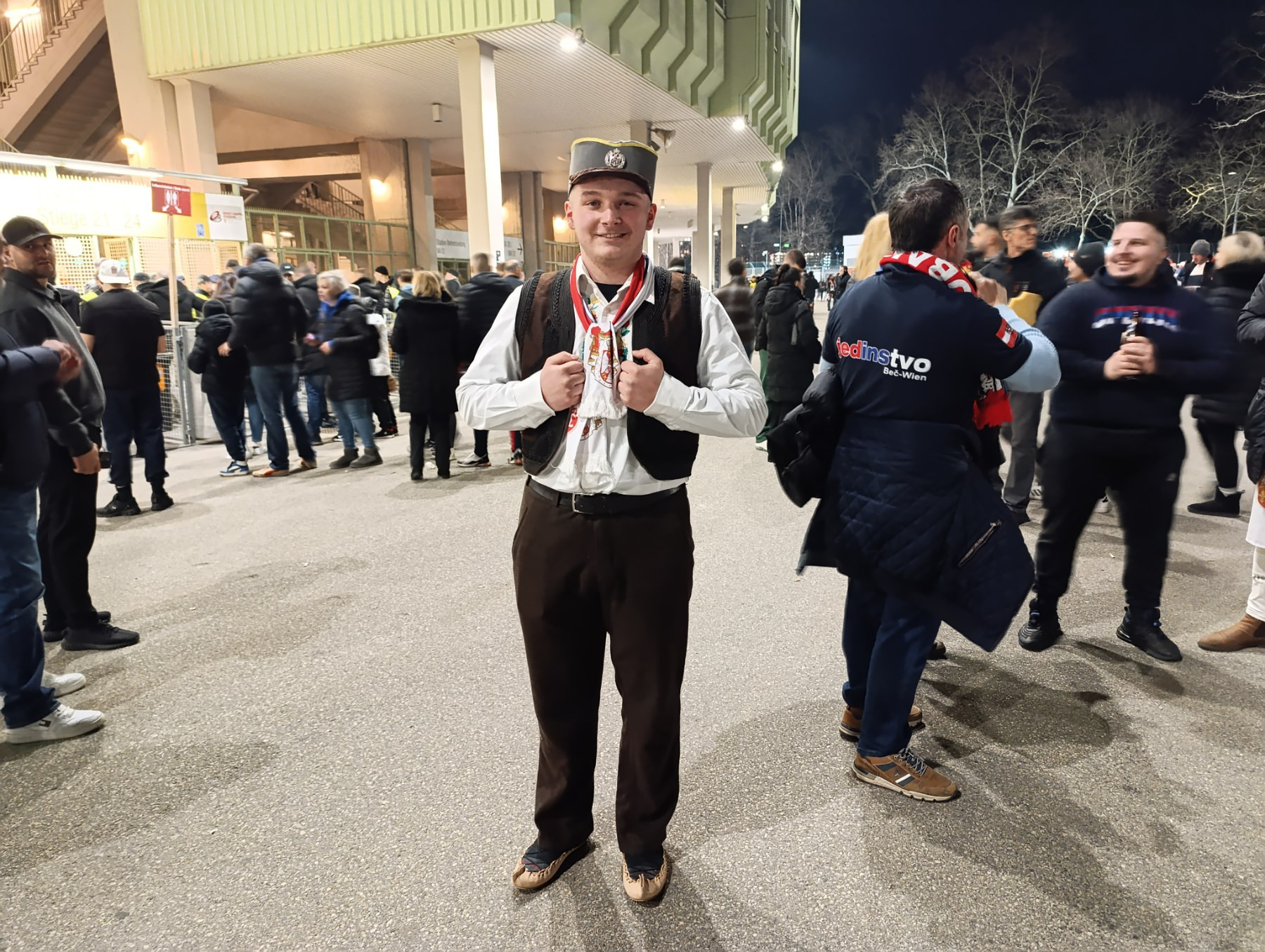 Okolina Ernst Hapela vrvi od zanimljivih kadrova punih nacionalnim simbolima poput zastava, navijačkih rekvizita, čak i narodne nošnje koju će jedan dečak ponosno poneti na stadion.