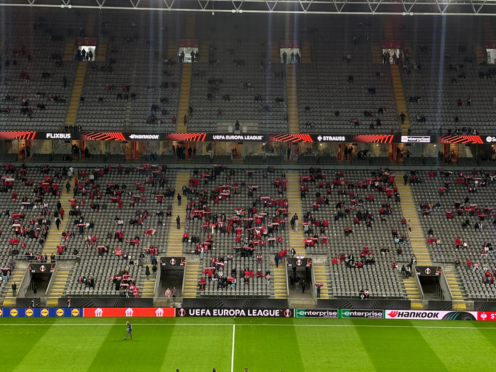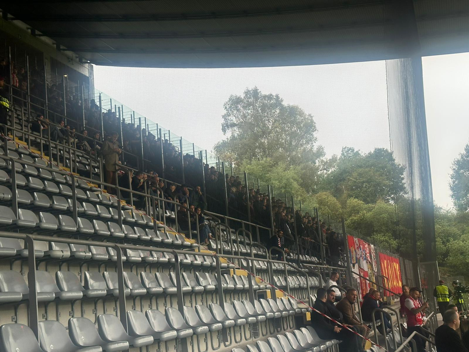 Ono što na prenosu ne možete da vidite jesu poprilično skromno ispunjene tribine ovog sjajnog zdanja iako se danas u gradu moglo osetiti da se večeras igra utakmica Lige Evrope.