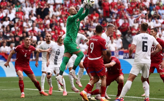 Nastavila je Srbija da pritiska, a onda u 57. minutu munjevita tranzicija Slovenaca, majstorski šut Šeška iz punog trka sa distance i magična odbrana Rajkovića, koji je izvukao loptu ispod same prečke.