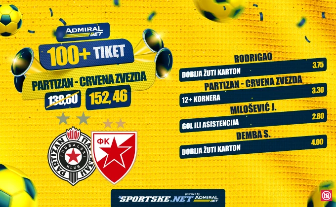 AdmiralBet 100+ tiket - Joca Milošević, Rodrigao, Sek i korneri za kvotu 152.46