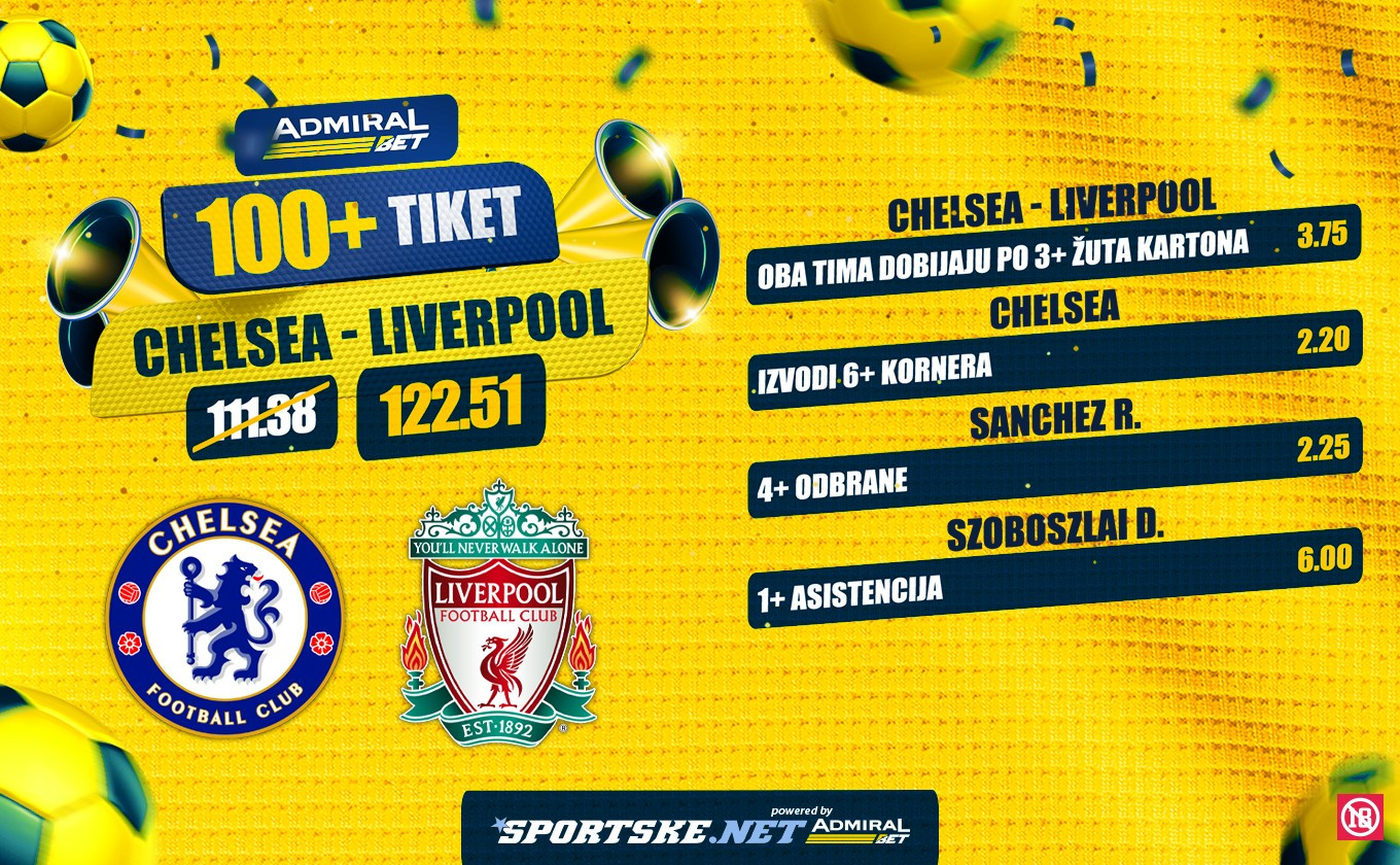 Kako ste navikli, AdmiralBet je i ovog vikenda pripremio specijalne ponude, a jedna od njih je i ''100+ tiket'' koji je vezan za večerašnji derbi engleske Premijer lige - duel Čelsija i Liverpula na ''Stamford bridžu''.