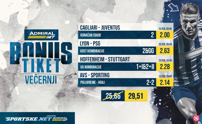 Uz kvotu koja je uvećana i umesto 25.66 iznosi 29.51, ne propustite AdmiralBet bonus tiket. Odigrajte ga OVDE.