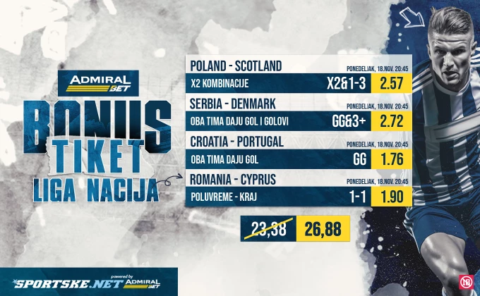 Današnji dan bogat je utakmica Lige nacija, a u skladu sa tim AdmiralBet i Sportske pripremili su za vas zanimljiv tiket.