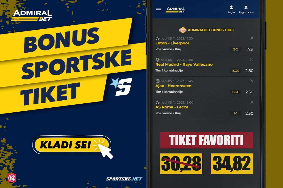 Kada smo sva ova četiri para stavili na tiket, dobijamo i poboljšanu kvotu - 34.82, a na sajtu AdmiralBeta OVDE možete pronaći bonus tiket pod radnim nazivom ''Tiket favoriti''.