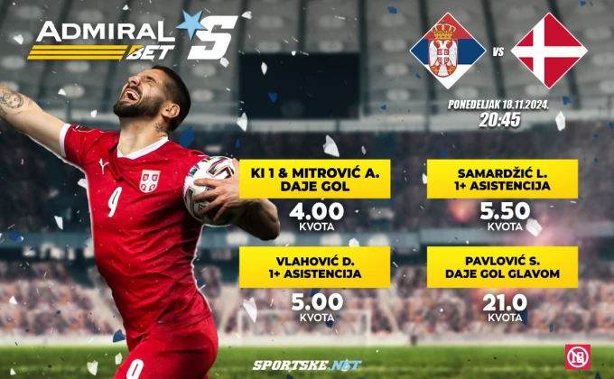 Tako se, primera raditi, možete opkladiti da će Srbija slaviti protiv "Danskog dinamita", a uz gol Aleksandra Mitrovića, igra vredi kvotu 4.