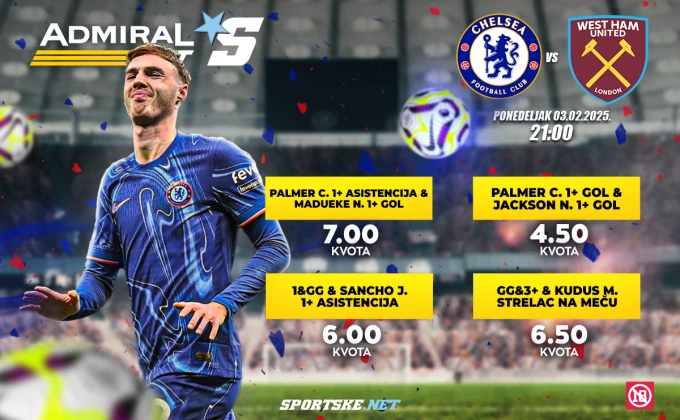 Mada ponedeljak slovi za fudbalski "najmrtviji" dan, ljubitelji Premijer lige će večeras moći da uživaju u londonskom derbiju između Čelsija i Vest Hema, a AdmiralBet vam je i ovaj put spremio odličnu ponudu u čijem fokusu će biti četiri stvari.