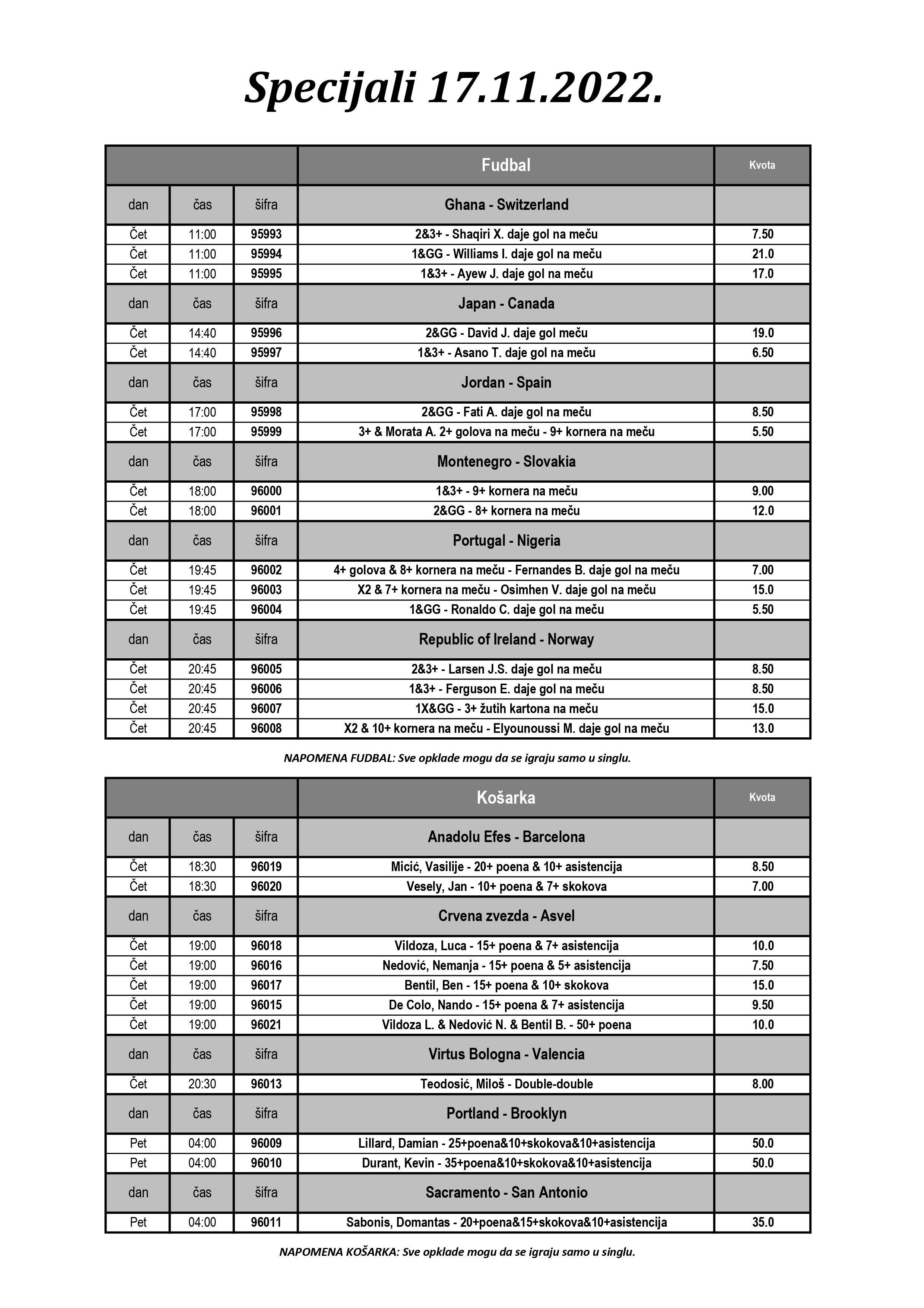 Kvota dana je pobeda na Portugal u prijateljskom meču protiv Nigerije i to prelaz iz 1-1 (kvota 1.85), imamo još fudbalskih specijala, a kompletnu ponudu pogledajte ovde.