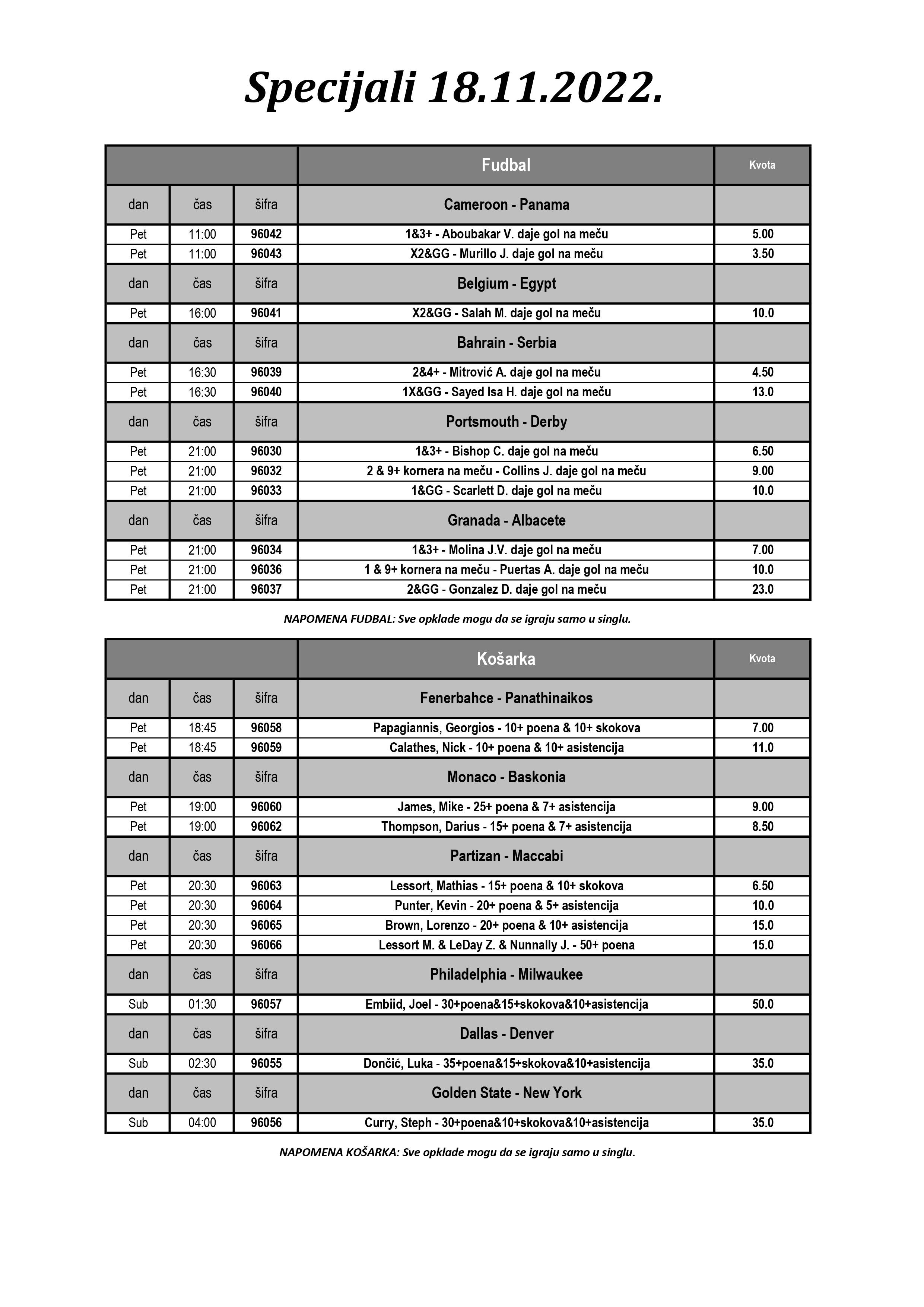 OVDE možete da proverite sve mogućnosti kada su u pitanju specijali, za večerašnju utakmicu.