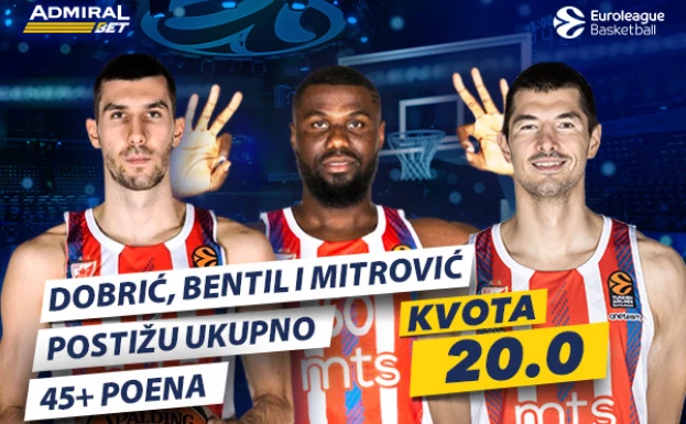 AdmiralBet želi nudi novi specijal za igrače Crvene zvezde,Dobrić, Bentil i Mitrović treba da postignu 45+ poena, kvota je odlična 20.