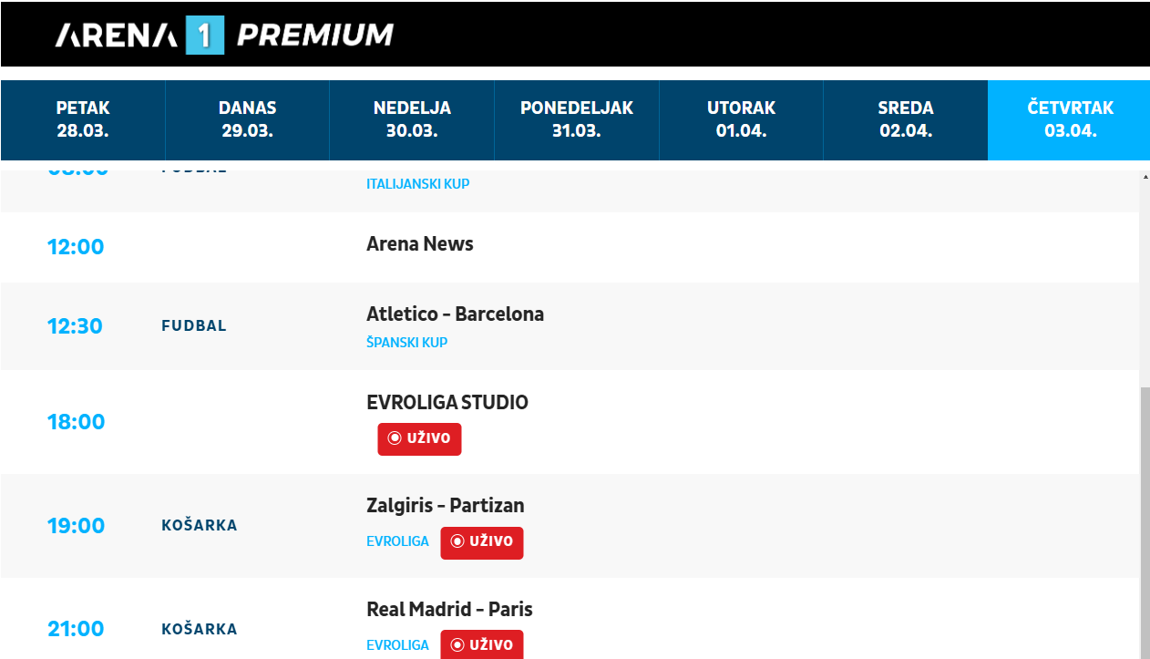Utakmica Crvene zvezde i Efesa iz "Beogradske arene" će takođe biti prenošena, ali programska šema za petak, 4. april, još uvek nije dostupna.
